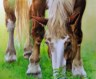 Working on a small painting of two horses I met at a local horse farm. I am enthralled by the large black friesian, a regal and gentle giant. He is tender with the other horses even as he towers over them. He poses without trying - there's not a position he assumes that isn't flat-out gorgeous. When I come by to study the group, he comes to me at the fence and studies me. There's a familiarity about him. He reaches his long velvety nose through the fence to check me out for treats (I must remember to bring carrots next time), nuzzling my camera, my pads, my backpack. Then he pulls back and studies me - honestly, it feels as if he is communicating.